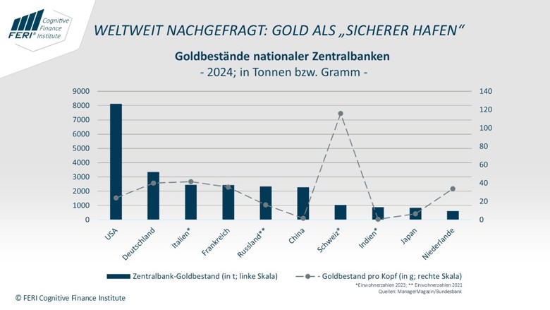 However, it is interesting to look at the gold reserves per capita: Germany and Italy are at the top of the list with around 40 g per capita, well ahead of France and the Netherlands with around 35 g each – and far ahead of the US with only around 24 g. The picture is much more robust for Switzerland, however, where each citizen accounts for around 116 g of gold reserves – currently equivalent to just under €12,000!